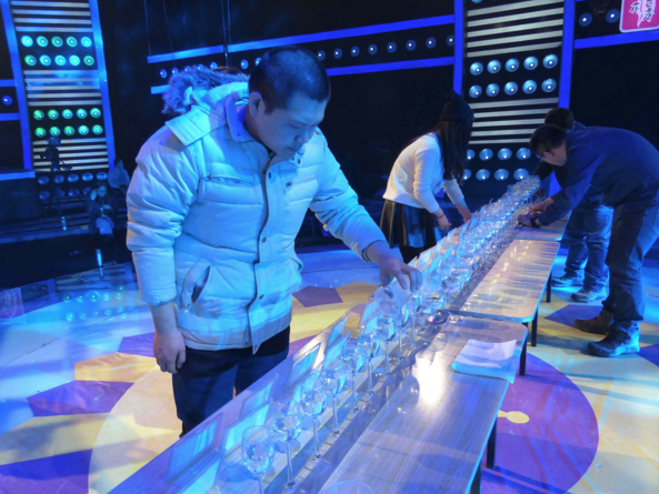 工作人員小心翼翼地把調好音的三十個高腳杯抬上了舞臺,準確的音高在現(xiàn)場獲得了滿堂喝彩,劉浩的聽音能力真是了得,他背對這些高腳杯,一次能夠分辨出同時發(fā)出的六個音!演出大獲成功!這個節(jié)目也在演出中獲得了令人欣喜的成績!